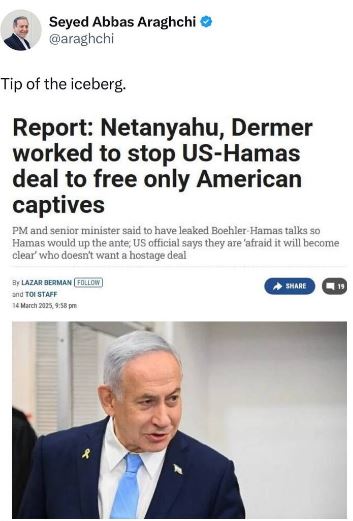 سید عباس عراقچی وزیر امور خارجه ایران، امروز (دوشنبه) گزارشهای منتشر شده درباره تلاش بنیامین نتانیاهو نخست وزیر و همچنین وزیر امور استراتژیک رژیم صهیونیستی برای متوقف کردن روند آزادی اسیر آمریکایی در غزه را «مشتی از خروار» توصیف کرد.