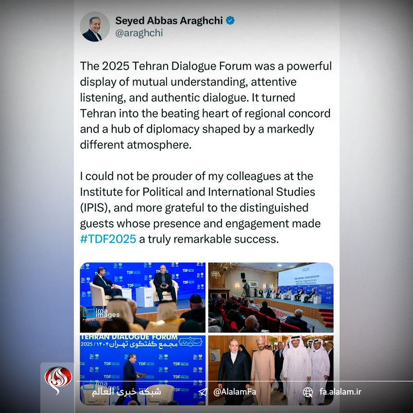 سید عباس عراقچی، وزیر خارجه کشورمان در مطلبی در شبکه اجتماعی ایکس با اشاره به برگزاری مجمع گفتگوی تهران طی روزهای یکشنبه و دوشنبه در مرکز مطالعات سیاسی و بینالمللی وزارت خارجه با حضور مهمانها و هیاتهایی از بیش از ۵۳ کشور جهان نوشت: مجمع گفتگوی تهران ۲۰۲۵ جلوهای از درک متقابل، گوشسپردن مسئولانه و گفتوگوی صادقانه بود.