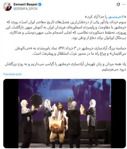 سخنگوی وزارت خارجه در شبکه ایکس به مناسبت سالروز حماسه آزادی خرمشهر نوشت: «خرمشهر را خدا آزاد کرد.»