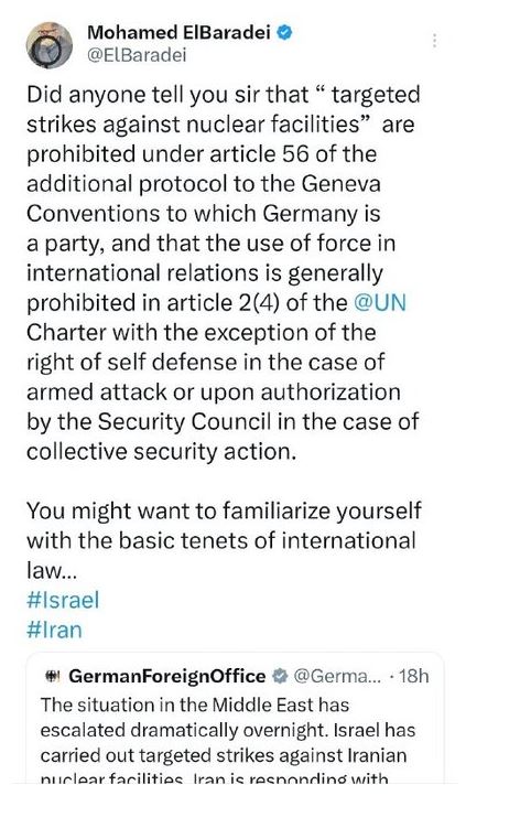 محمد البرادعی، مدیرکل مصری سابق آژانس بین‌المللی انرژی اتمی در واکنش به بیانیه وزارت خارجه آلمان در حمایت از حمله نظامی اسراییل به ایران، در حساب ایکس خود نوشت: آیا کسی تا به حال به شما گفته که «حملات هدفمند به تأسیسات هسته‌ای» بر اساس ماده ۵۶ پروتکل الحاقی کنوانسیون‌های ژنو (که آلمان نیز عضو آن است)، ممنوع است؟