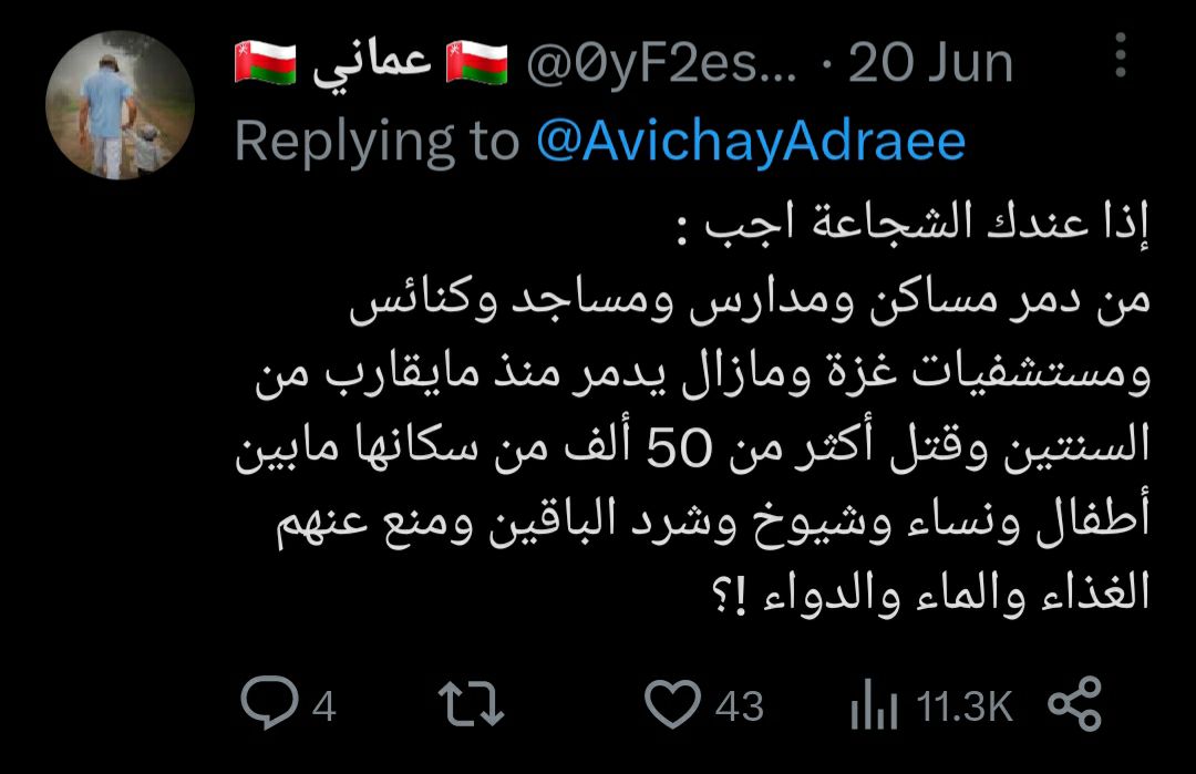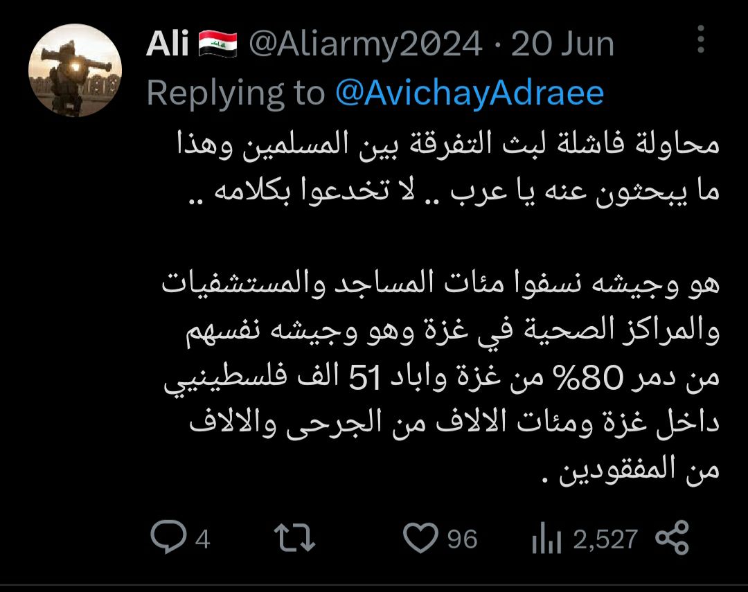 واکنش «علی» یکی دیگر از کاربران در برابر یاوه‌گویی سخنگوی ارتش اشغالگر نیز جالب بود. وی نوشت: تلاشی شکست‌خورده برای اختلاف‌افکنی میان مسلمانان! ای مردم عرب فریب سخنان او را نخورید. او و ارتشش صدها مسجد و بیمارستان و مراکز بهداشتی در غزه را با خاک یکسان کردند. او و ارتشش 80 درصد از غزه را ویران کردند و 51 هزار فلسطینی را به قتل رسانده و صدها هزار فلسطینی را مجروح و هزاران فلسطینی را آواره کردند.
