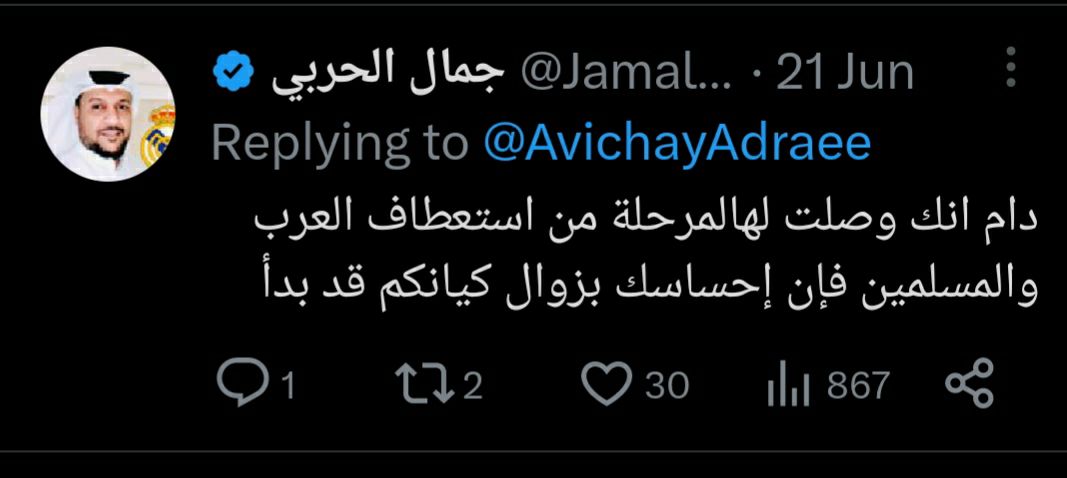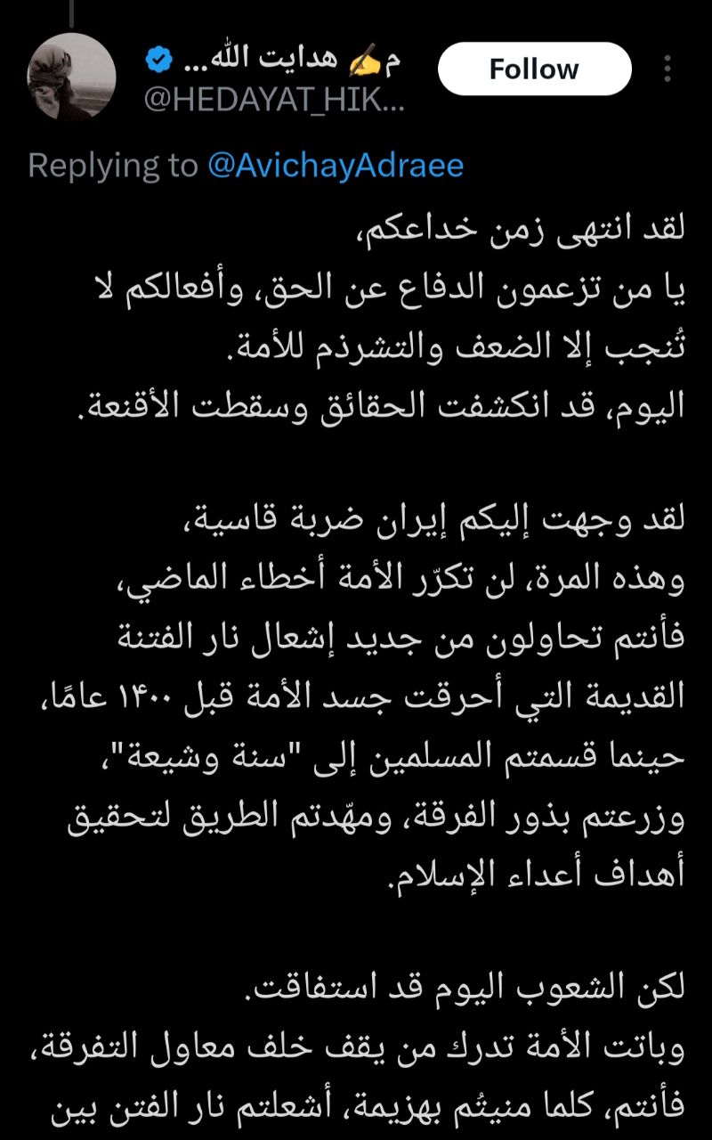 واکنش کاربران عرب به توییت‌های سخنگوی عرب‌زبان ارتش رژیم صهیونیستی که به رغم نسل‌کشی این رژیم در غزه در صدد است؛ ایران را دشمن اعراب و مسلمانان معرفی کند، در نوع خود جالب است.