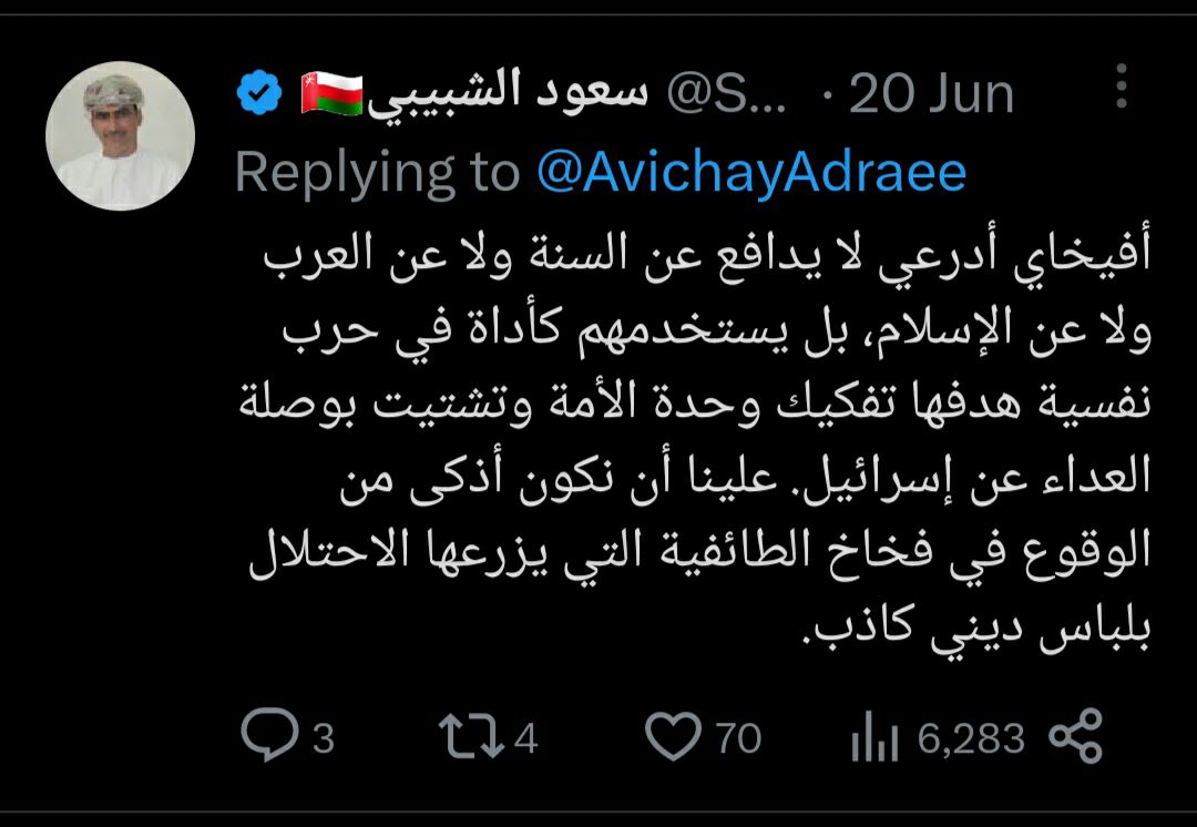 پاسخ این کاربر عرب به نام «سعود الشبیبی» نیز هوشمندانه است که می‌گوید: افیخای ادرعی از اهل سنت و یا عربها و مسلمانان دفاع نمی‌کند، بلکه از آنها به‌عنوان ابزاری برای راه‌اندازی جنگ روانی به منظور ضربه زدن به وحدت جهان اسلام استفاده می‌کند تا نوک پیکان دشمنی را از اسرائیل تغییر دهد‌. ما باید هوشیار باشیم و در دام طائفی‌گری نیفتیم.