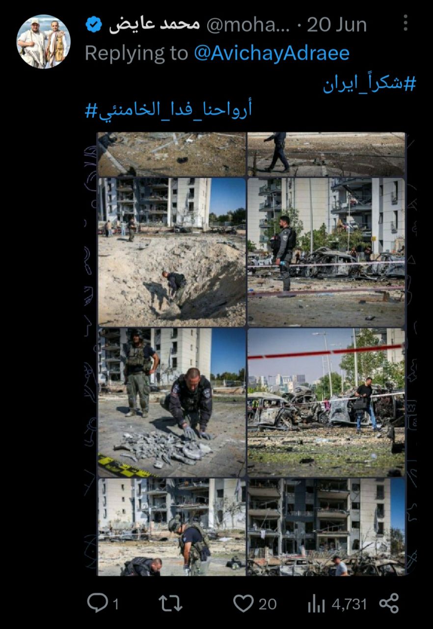 کاربر دیگری به نام «محمد عایض» با انتشار تصاویری از خسارات حمله موشکی ایران به اسراییل نوشته است: ایران متشکریم.
