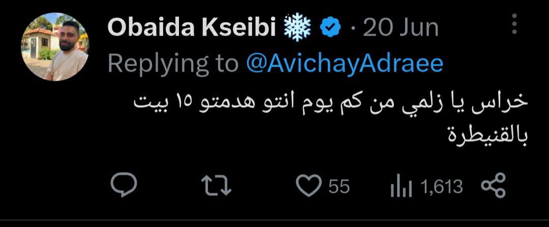 کاربر دیگری به نام «عبیده کسیبی» گفت: ساکت شو! چند روز پیش اسرائیل در قنیطره (سوریه) 15 خانه را ویران کرد.