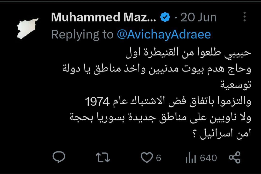 کاربری دیگر نوشت: شما اول از قنیطره خارج شوید و تخریب منازل غیرنظامیان را متوقف کنید و به توافق سال 1974 پایبند باشید یا می‌خواهید به بهانه امنیت اسرائیل، مناطق جدیدی از سوریه را اشغال کنید؟