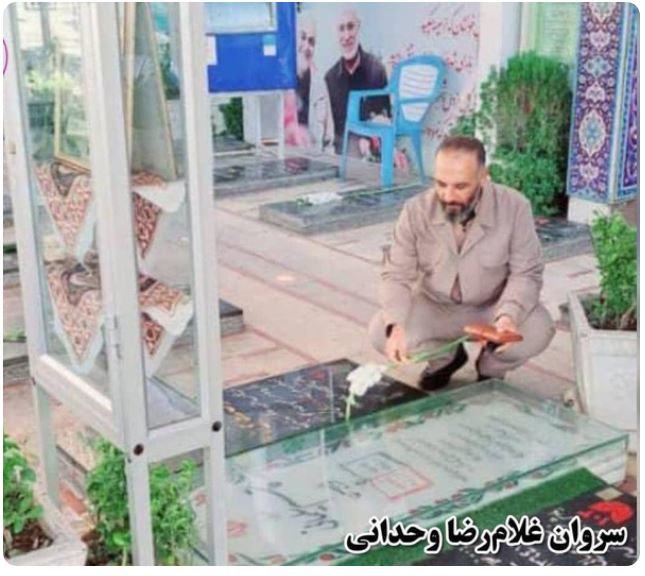 تصویری از سروان «غلامرضا وحدانی» فرمانده پاسگاه دامن که بر سر گلزار شهید حاج قاسم سلیمانی