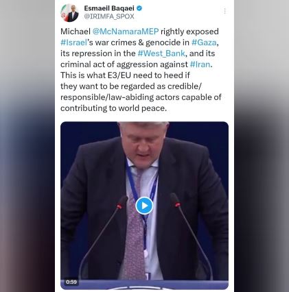 اسماعیل بقایی سخنگوی وزارت امور خارجه ایران، با انتشار پیامی در شبکه اجتماعی ایکس نوشت: مایکل مک نامارا نماینده پارلمان اروپا جنایات جنگی و نسلکشی رژیم صهیونیستی در غزه و سرکوب مردم فلسطین در کرانه باختری، و تجاوز جنایتکارانه آن علیه ایران را تبیین کرد.