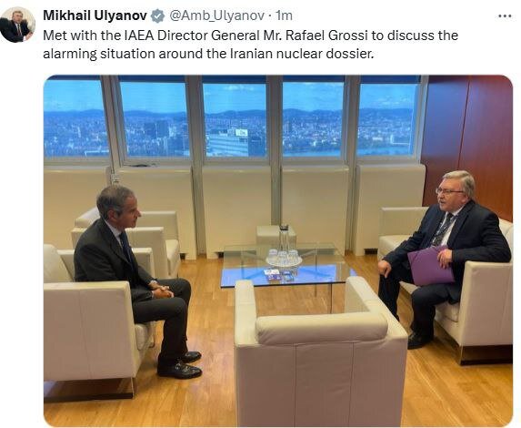 نماینده دائم روسیه در نهادهای بینالمللی مستقر در وین در این خصوص نوشت: با رافائل گروسی مدیرکل آژانس بینالمللی انرژی اتمی، دیدار کردم تا درباره وضعیت نگرانکننده پیرامون پرونده هستهای ایران گفتگو کنم.