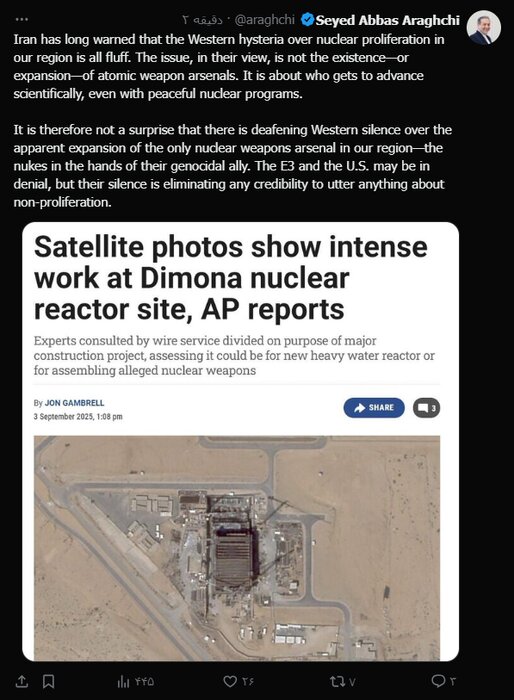 عراقچی در حساب کاربری خود در شبکه اجتماعی ایکس (توئیتر سابق)، نوشت: ایران همواره هشدار داده که هیستری غرب درباره گسترش تسلیحات هستهای در منطقه ما به طور کامل تصنعی است.