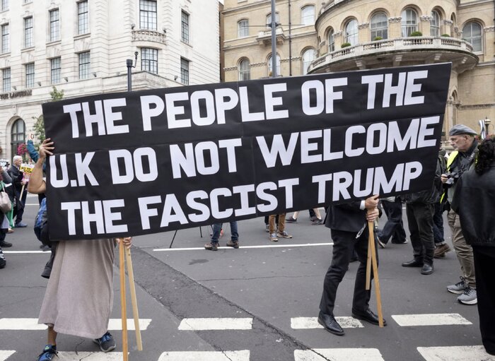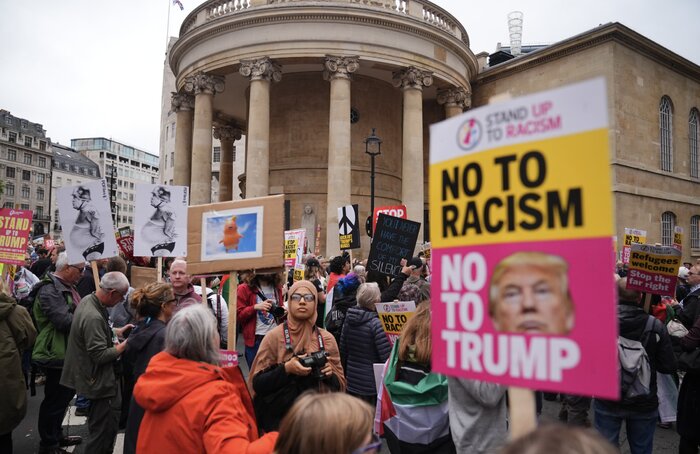 معترضان از ملیتها و اقشار مختلف مردم، با حمل پلاکاردها و سردادن شعارهایی علیه ترامپ، او را رهبری نژادپرست، تفرقهافکن و اقتدارگرایی خودکامه توصیف و تأکید کردند که وی در انگلیس جایگاهی ندارد. در میان جمعیت گروهی نیز با در دست داشتن پرچم جمهوری اسلامی ایران، حملات غیرقانونی آمریکا علیه تأسیسات هستهای کشورمان و تحریمهای یکجانبه واشنگتن را محکوم کردند.