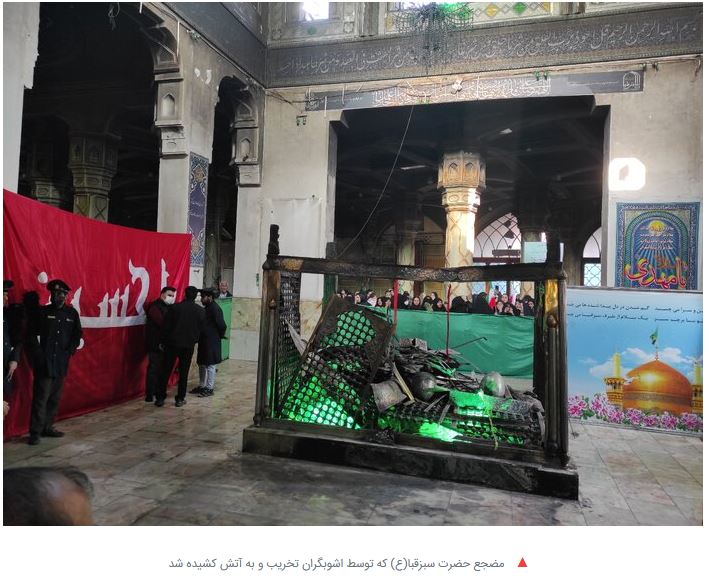 آشوبگران حتی به مزار سردار سپهبد شهید غلامعلی رشید فرمانده اسبق قرارگاه مرکزی خاتم الانبیا که در حیاط حرم حضرت سبزقبا(ع) بود هم رحم نکردند و با شکستن شیشه روی مزار، اقدام به هتک حرمت و سوزاندن آن قبر شریف کردند.