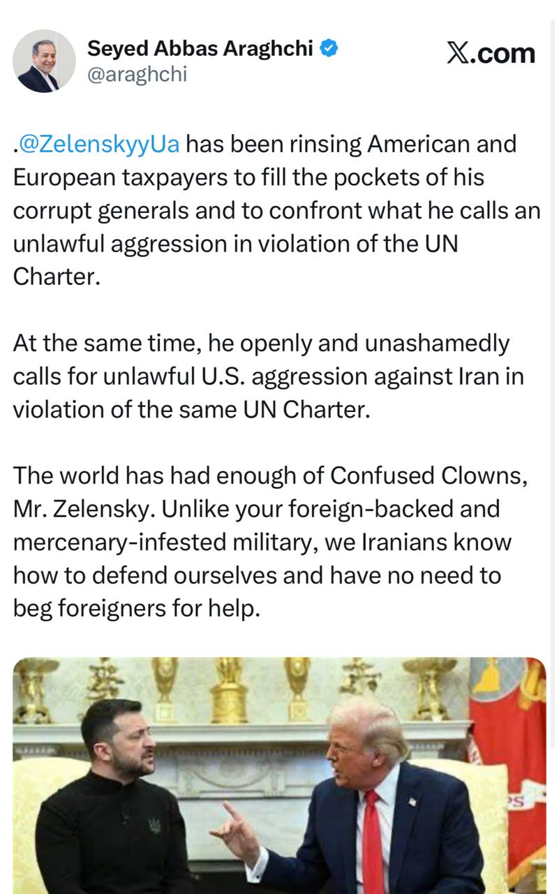 آقای زلنسکی، جهان دیگر از دلقکهای سردر گم خسته شده است. برخلاف ارتش متکی به خارج و پر از مزدور شما، ما ایرانیان بهخوبی میدانیم چگونه از خود دفاع کنیم و هیچ نیازی به التماس از بیگانگان برای کمک نداریم.
