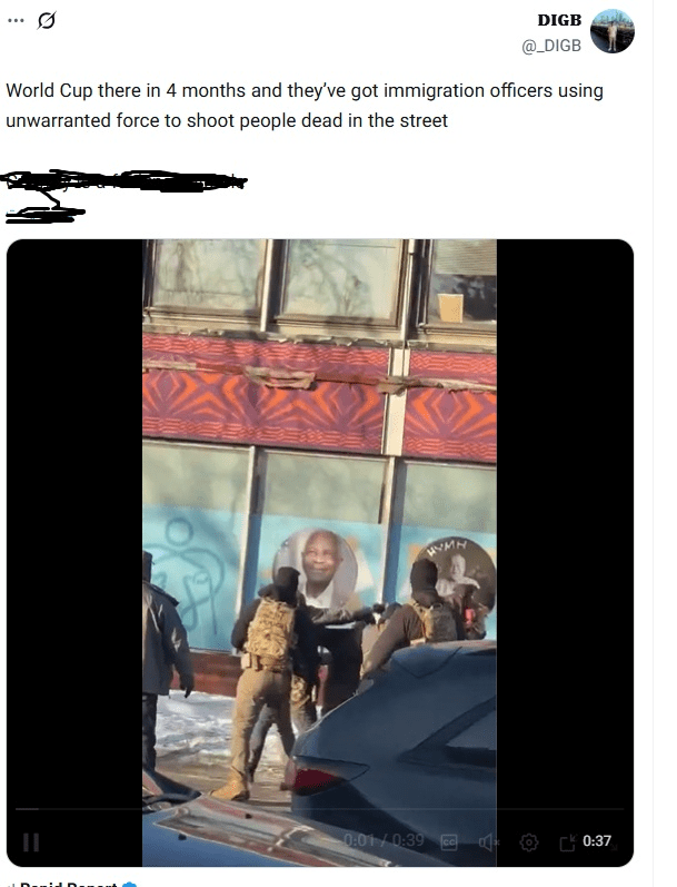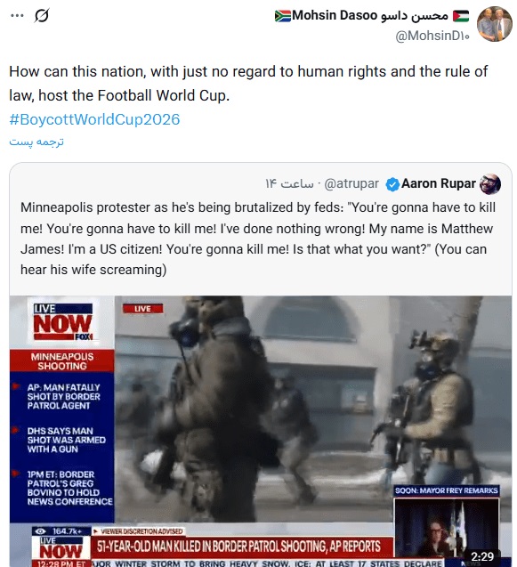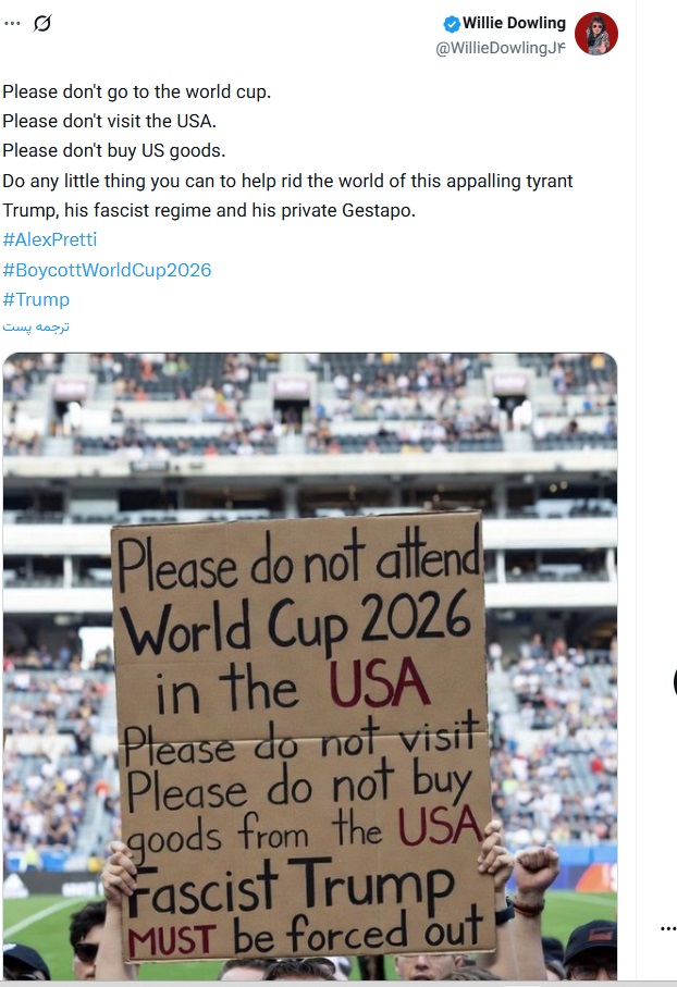 «چهار ماه دیگر جام جهانی آنجاست و ماموران مهاجرت دارند با زور و اجبار مردم را در خیابانها به رگبار میبندند و میکشند!»، این واکنش DIGB کاربر اسکاتلندی به کشتن بیرحمانه یک پرستار در خیابانهای آمریکا توسط پلیس مهاجرت این کشور است.کمپین بایکوت جام جهانی بعد از کشته شدن این شهروند آمریکایی در فضای ایکس به راه افتاده و تاکنون طبق گزارش اکانتهای فعال فضای مجازی بیش از 16 هزار نفر، بلیت خود را برای حضور در جام جهانی لغو کردند.