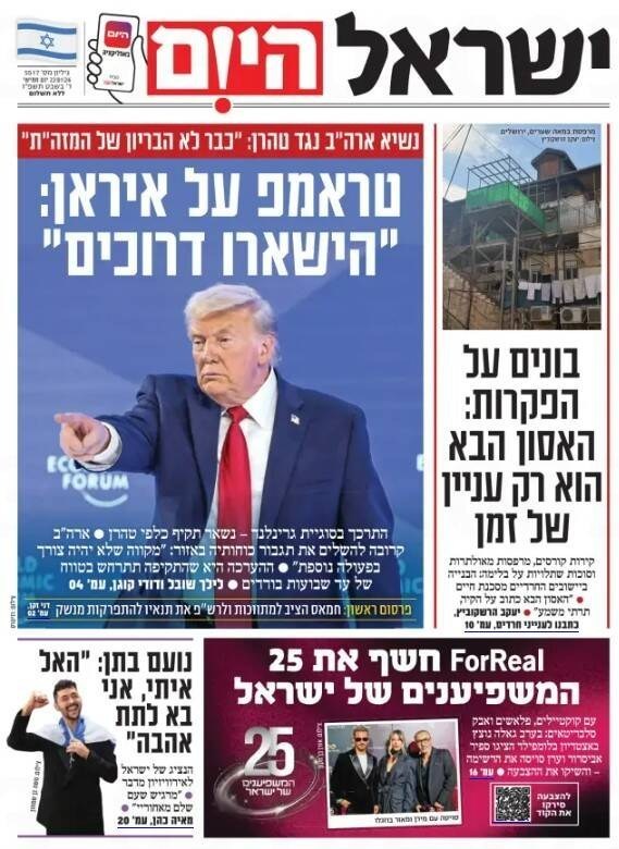 روزنامههای عبری زبان در تیتر نخست خود به یاوهگوییهای ترامپ علیه ایران و جنگ روانی در رابطه با احتمال وقوع جنگ در منطقه پرداختند.