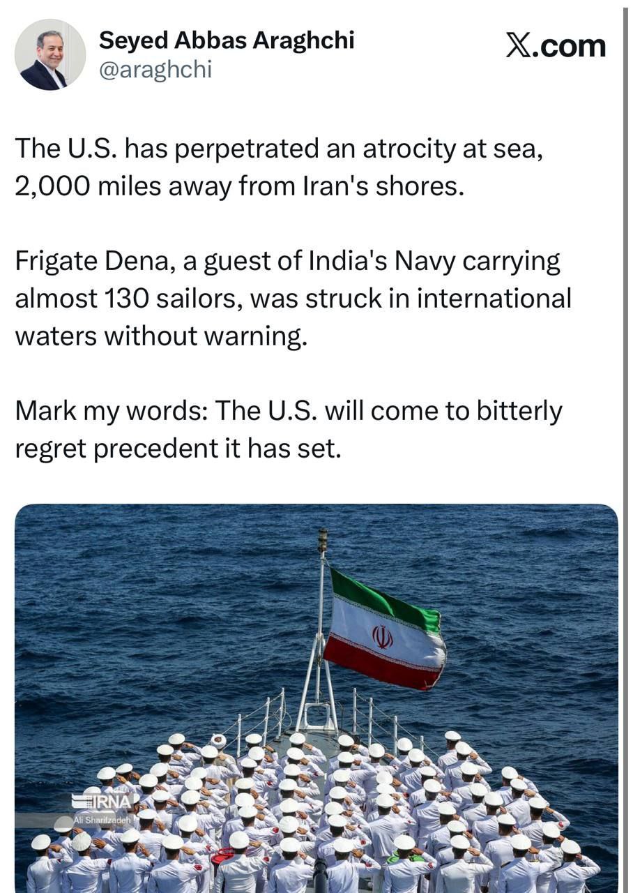 سید عباس عراقچی، وزیر امور خارجه کشورمان در واکنش به غرق شدن ناوچه دنا توسط ارتش تروریستی آمریکا تاکید کرد: ایالات متحده از این سابقهای که ایجاد کرد، بهشدت پشیمان خواهد شد.