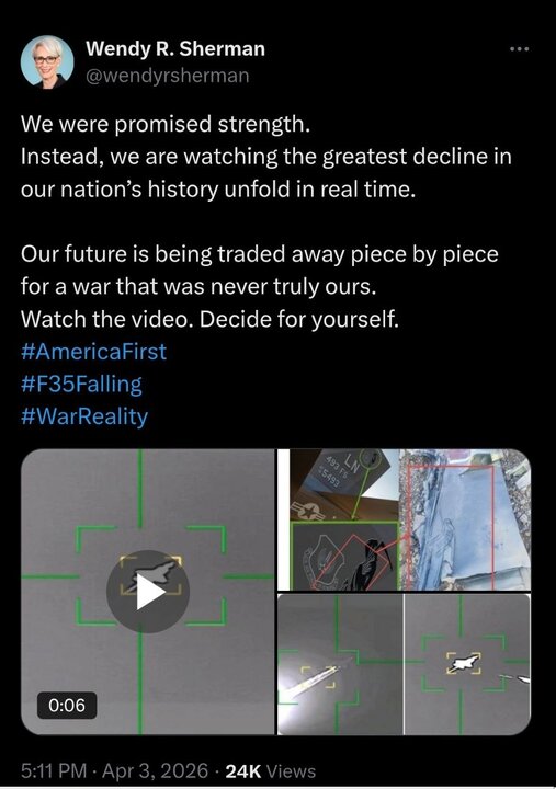 او از هشتگهای «#آمریکا_اول»، «#سقوط F۳۵» و «#واقعیت_جنگ» استفاده کرده که نشاندهنده نگرانی عمیق از تضعیف عملیات هوایی و هزینههای فرسایشی جنگ افروزی آمریکا علیه ایران است.